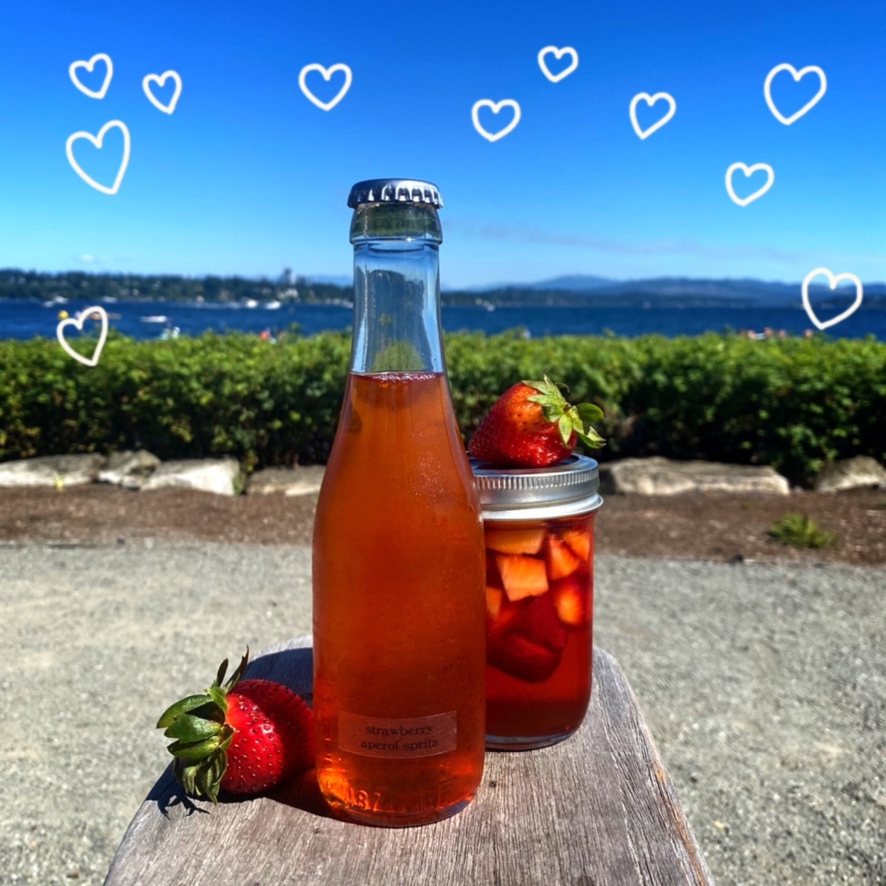 Using a DrinkMate, we carbonate the Prosecco, strawberry-infused Aperol, St-Germain and Zero-filtered water. The end result is a strawberry-infused Aperol Spritz, ready to drink out of the bottle! Or pour over ice in a wine glass and garnish with a strawberry!